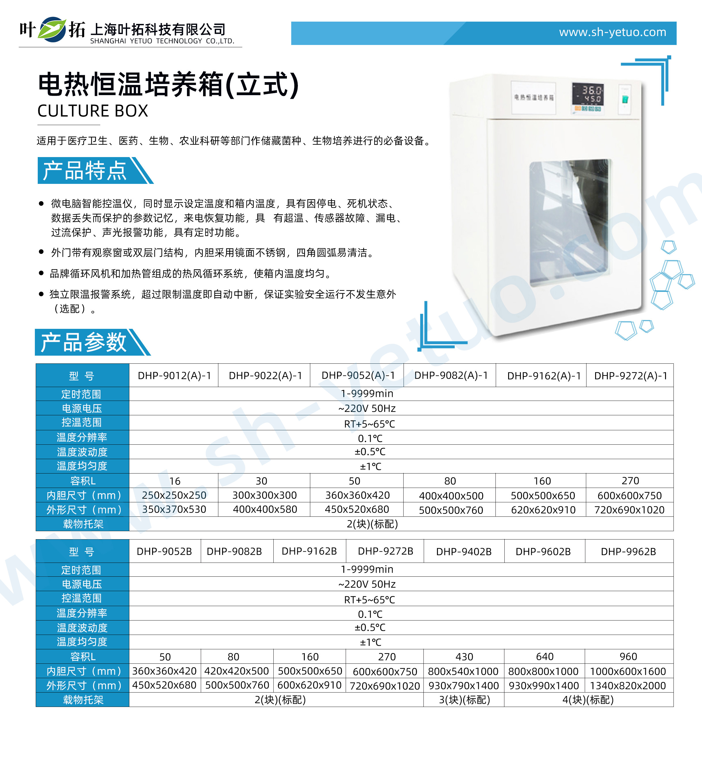 1. The microcomputer intelligent temperature controller displays the set temperature and the temperature in the box at the same time, has the parameter memory protected due to power failure, crash state and data loss, and has the function of incoming call recovery, overtemperature, sensor fault, leakage, overcurrent protection, audible and visual alarm, and has the function of timing.