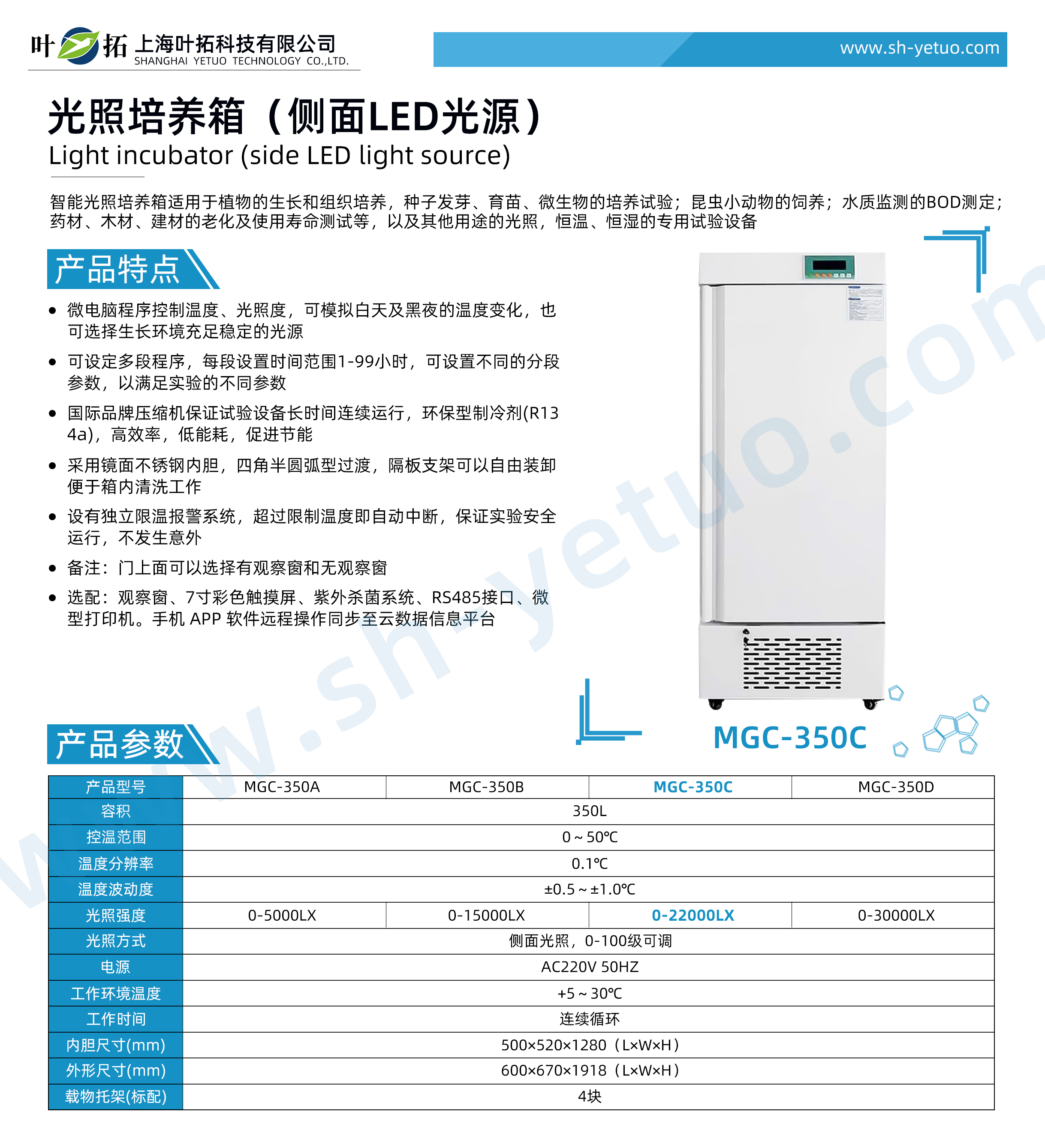 The intelligent lighting incubator is suitable for plant growth and tissue culture, seed germination, seedling cultivation, and microbial cultivation experiments; The breeding of insects and small animals; BOD determination for water quality monitoring; Special testing equipment for aging and service life testing of medicinal materials, wood, and building materials, as well as lighting, constant temperature, and humidity for other purposes