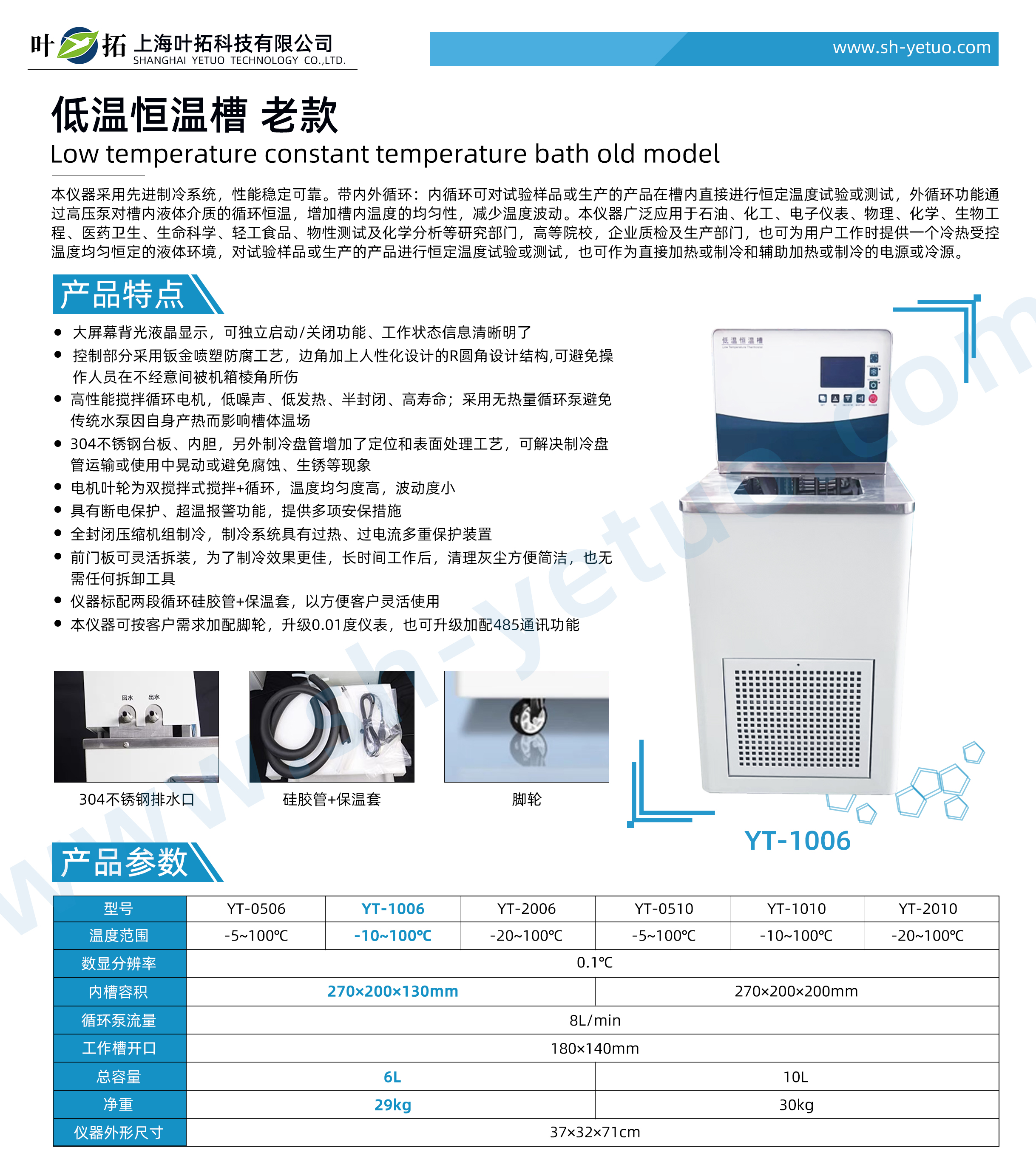Product Overview: This instrument adopts an advanced refrigeration system, with stable and reliable performance. Internal and external circulation: The internal circulation can directly conduct constant temperature tests or tests on test samples or produced products in the tank. The external circulation function uses a high-pressure pump to circulate the liquid medium in the tank at constant temperature, increasing the uniformity of the temperature in the tank and reducing temperature fluctuations. This instrument is widely used in research departments such as petroleum, chemical engineering, electronic instruments, physics, chemistry, bioengineering, medicine and health, life sciences, light industry and food, physical property testing, and chemical analysis, as well as in higher education institutions, enterprise quality inspection and production departments. It can also provide users with a cold and hot controlled liquid environment with uniform and constant temperature during work, and conduct constant temperature tests or tests on test samples or produced products, It can also be used as a power or cold source for direct heating or cooling and auxiliary heating or cooling.